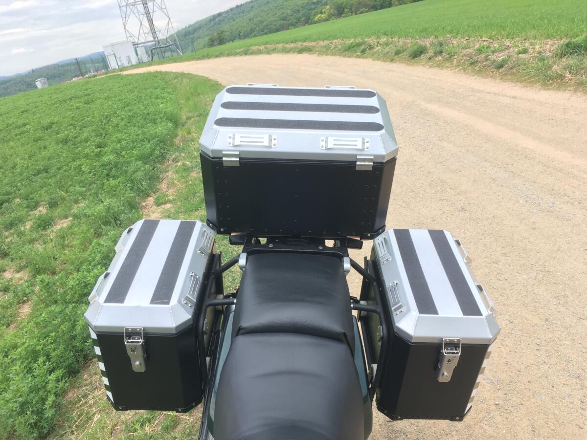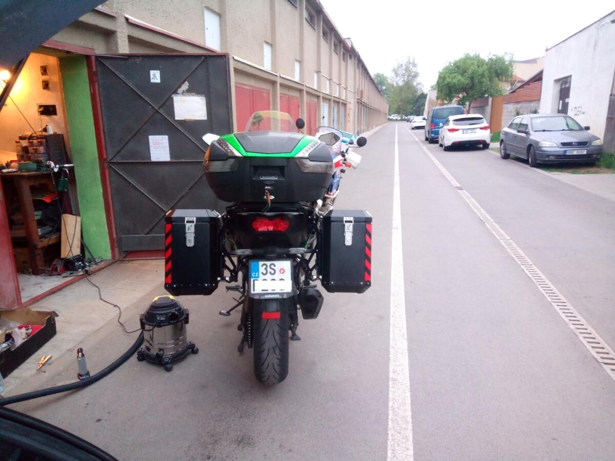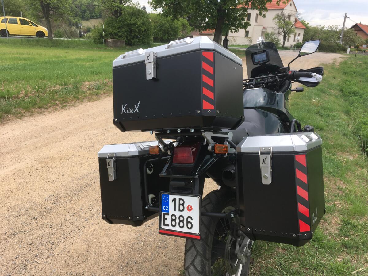 Bočáky Stoupex s prohnutím ke kolu pro nosič PLX side + Topcase Wanderex s opěrkou vlastní výroby