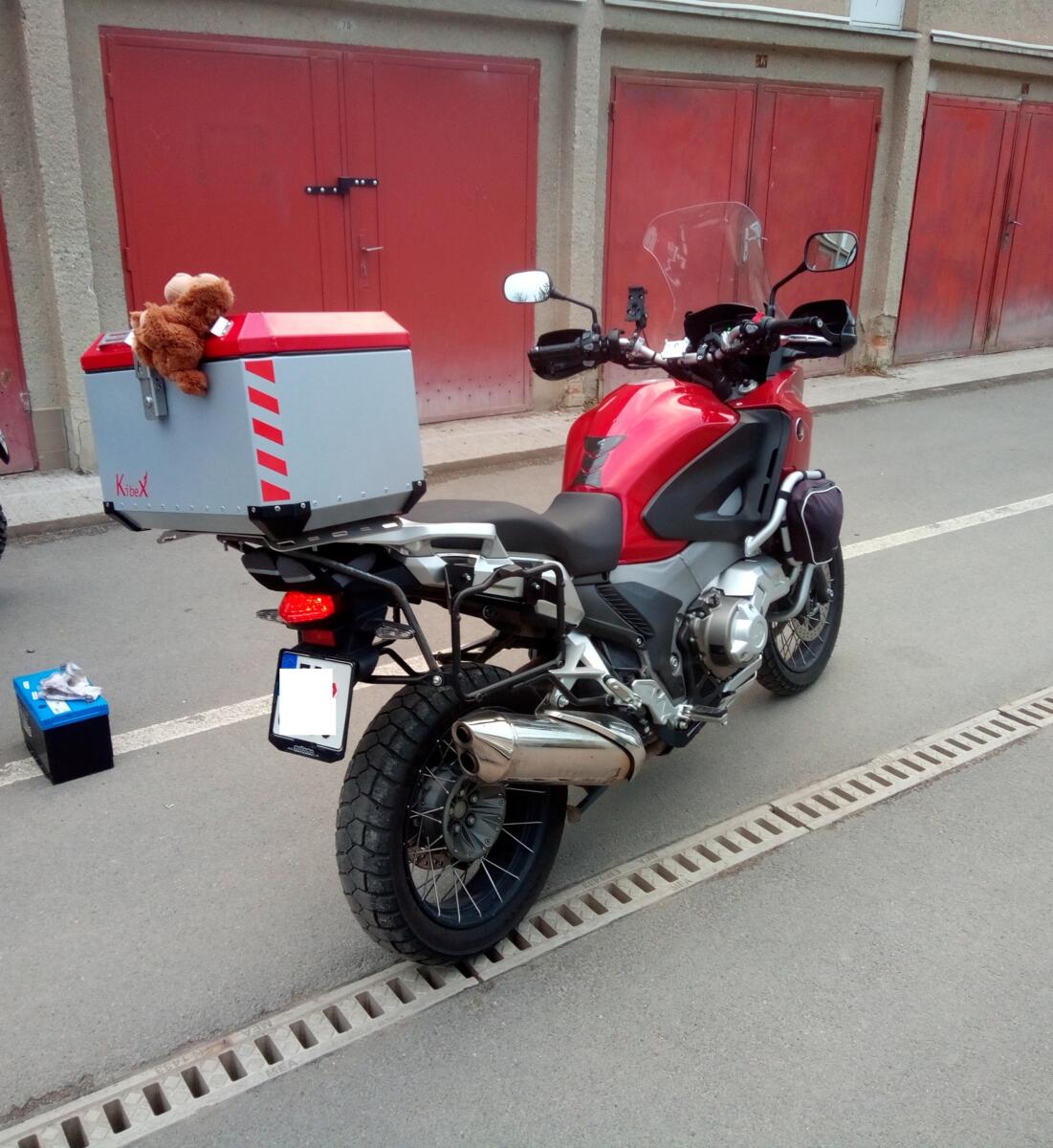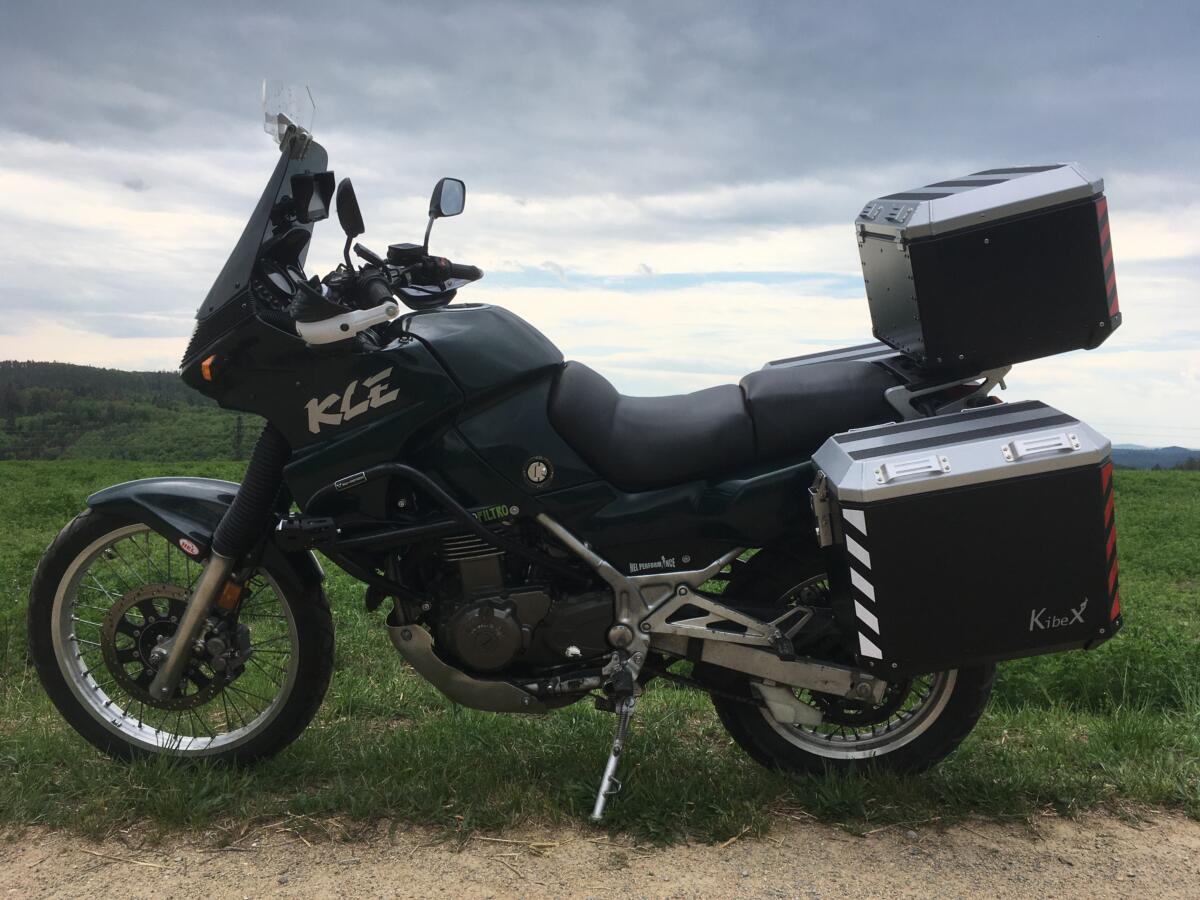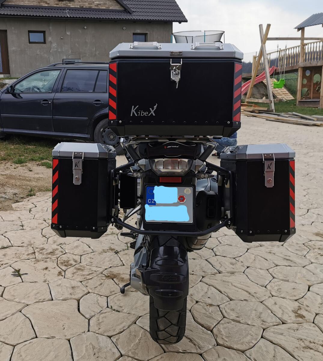 Bočáky Stoupex s prohnutím ke kolu pro nosič PLX side + Topcase Wanderex s opěrkou vlastní výroby